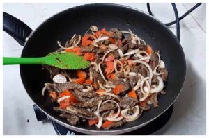 انقلي اللحم إلى قدر على نار متوسطة، ثمّ أضيفي البندورة والبصل وقلّبي المكونات على نار هادئة حتى النضج وأضيفي القليل من الماء كلّما أحسستِ بأن اللحم تشرّب ماءه.