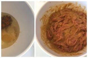 امزجي في وعاء كبير الخل، الثوم، بهارات الشاورما، الملح، الفلفل الأسود المطحون ولبن الزبادي، ثم انقعي لحم الشاورما بهذه التتبيلة مدة ليلة كاملة.