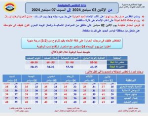 أعلنت الهيئة العامة للأرصاد الجوية توقعات الطقس للأيام الستة المقبلة، بدءًا من اليوم الاثنين وحتى السبت 7 سبتمبر.